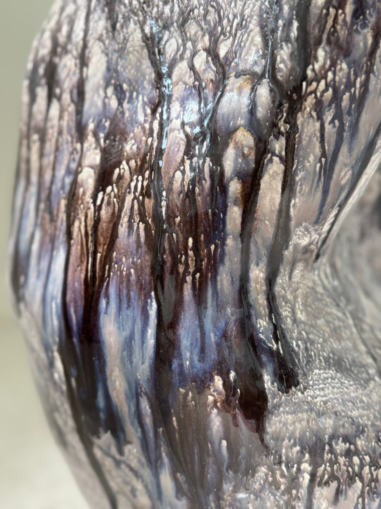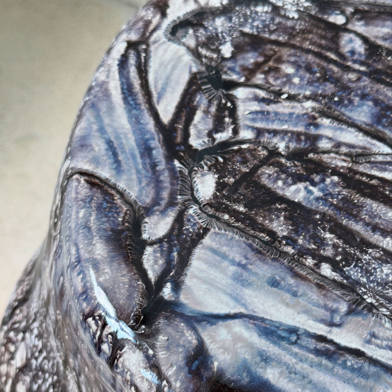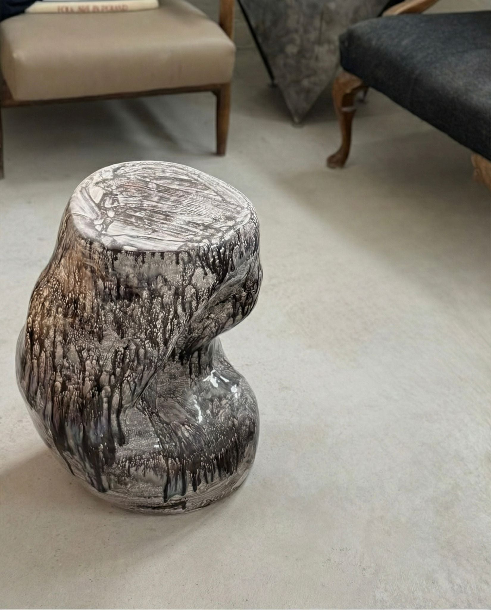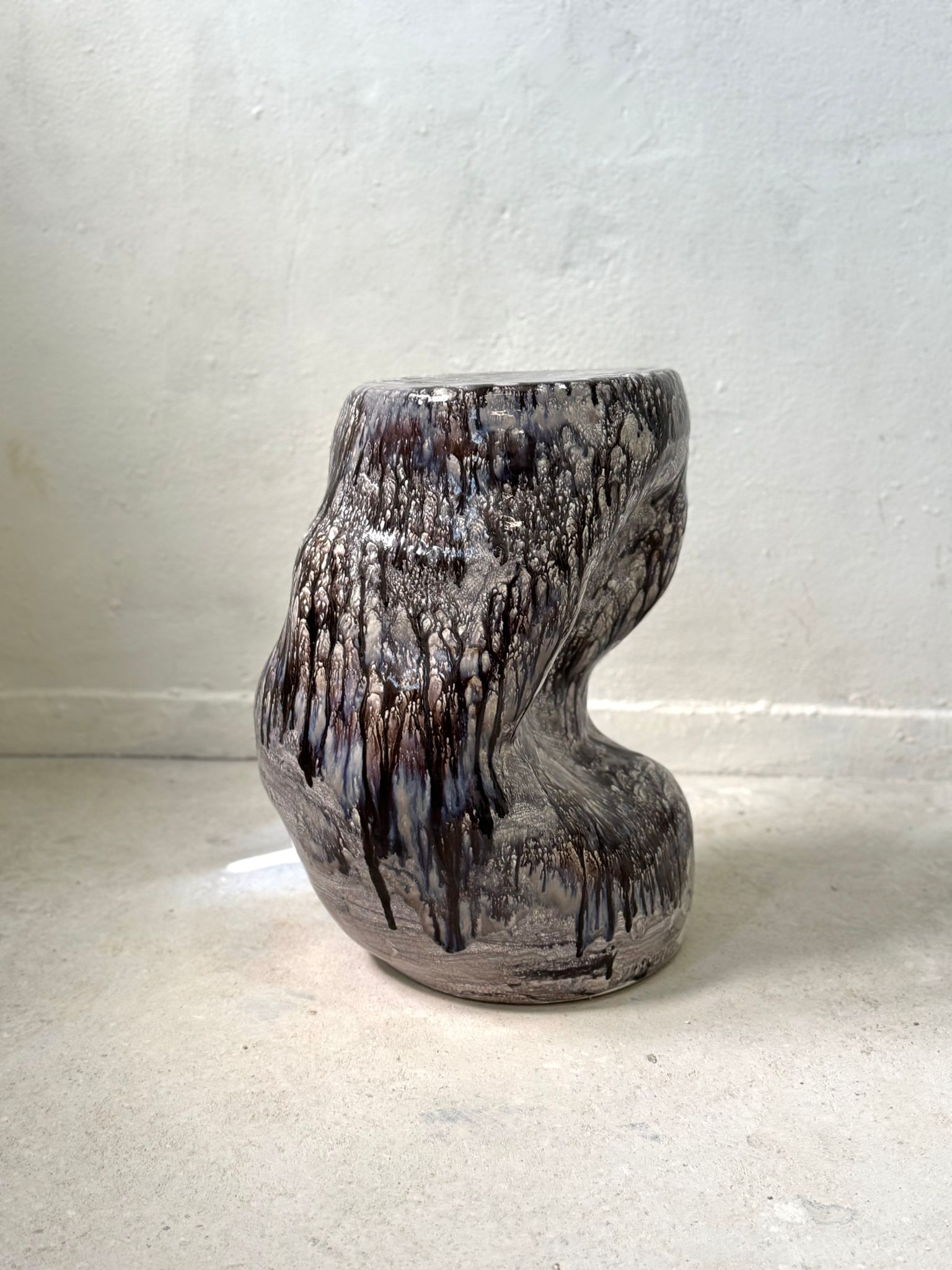 ABOUT THE OBJECTHand-sculpted from clay, the object becomes a living canvas for an experimental glazing technique developed exclusively for this piece. Cascades of white, deep blue, and slate grey interpenetrate and bleed into one another, forming a surface that feels like a frozen moment of liquid movement. The glaze flows unpredictably across the sculpted form, echoing the raw, untamed beauty of crashing waves suspended in time. No two pieces are ever alike each table emerges as a one-of-a-kind composition shaped by fire, gravity, and instinct. Balancing between art and function, the obejct serves as a sculptural side table, additional seating, or a standalone statement object. It invites contemplation, bringing depth, texture, and quiet intensity into any interior.
