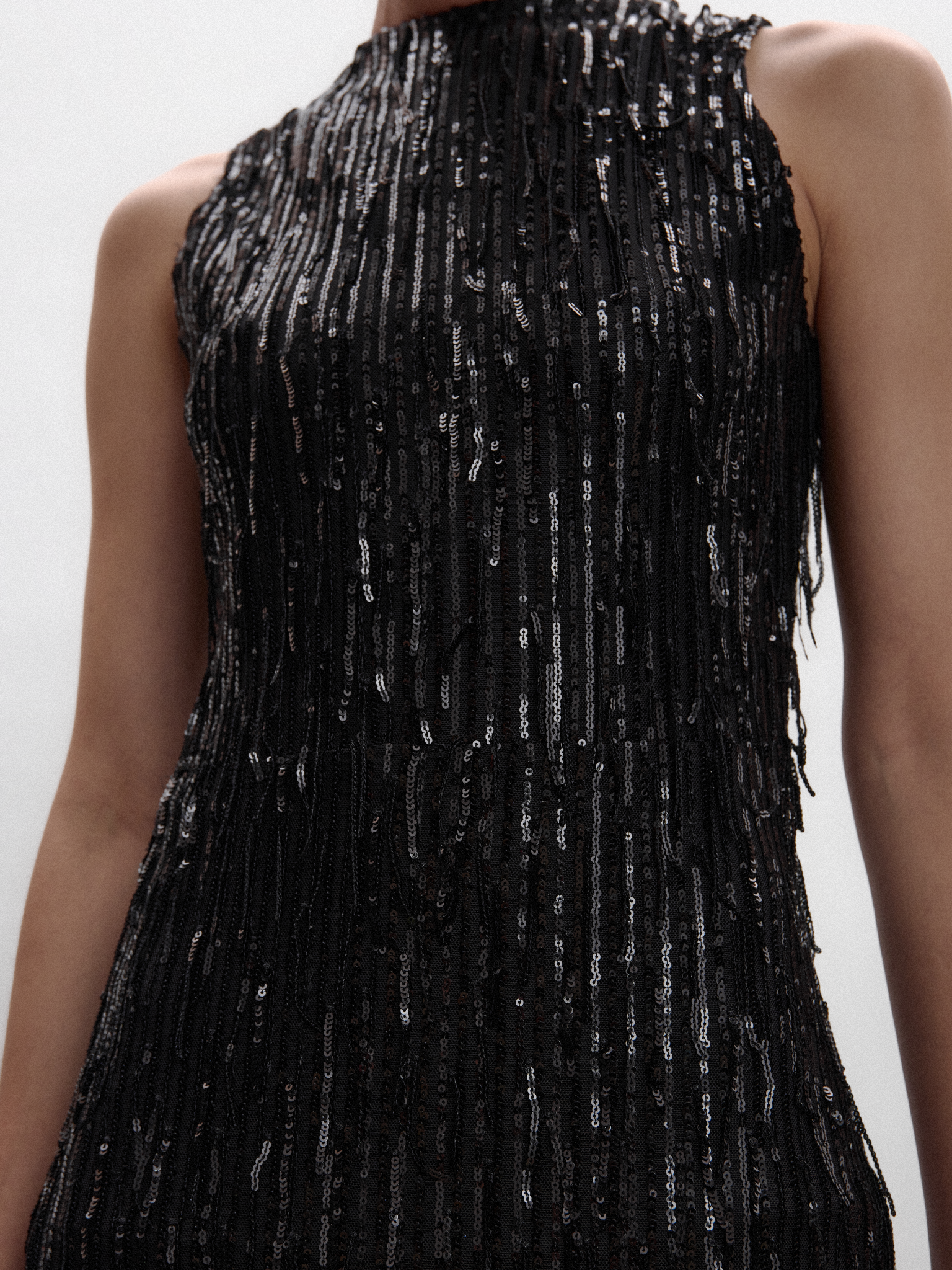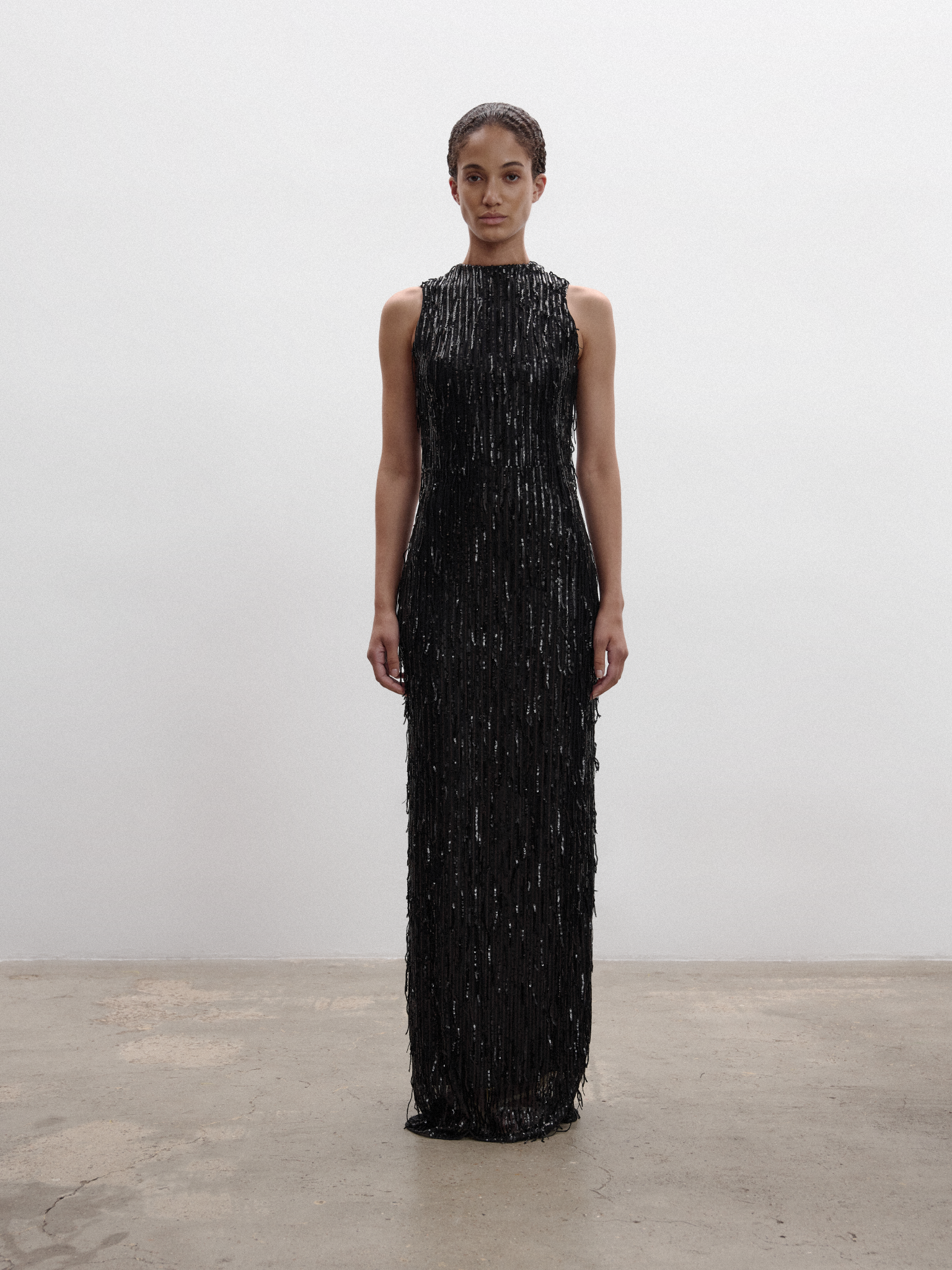 SLEEVELESS SEQUIN FRINGE EVENING GOWN IN BLACK