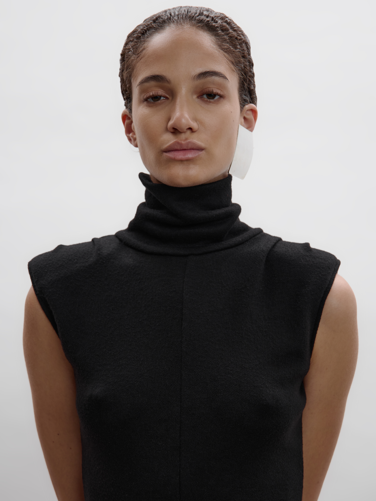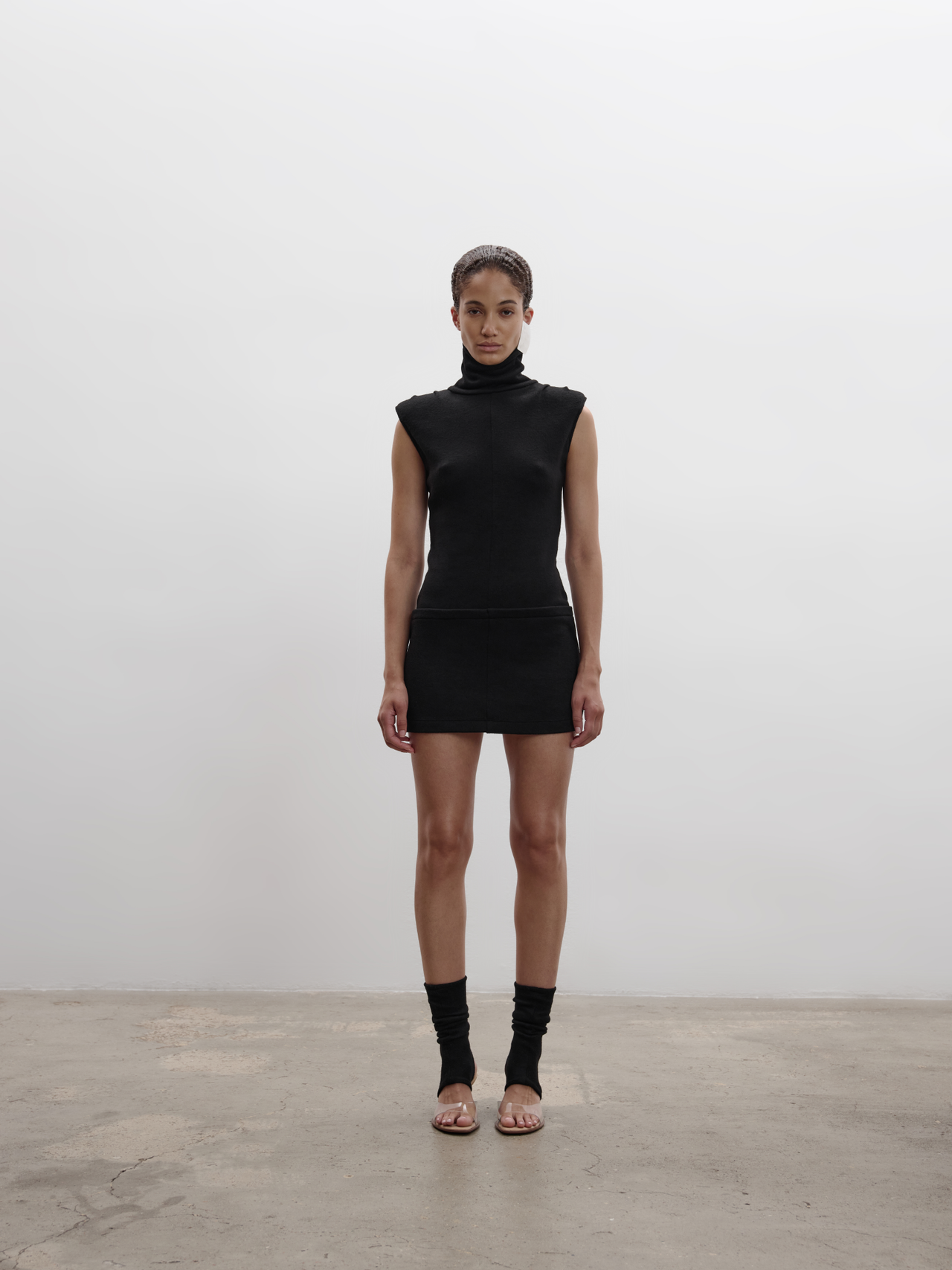 BODYCON MINI DRESS WITH A HIGH NECK. MADE FROM A SOFT, STRETCHY KNIT WITH A TOUCH OF CASHMERE FOR A REFINED FEEL. DESIGNED WITH SHOULDER PADS TO CREATE A SHARP, SCULPTED LINE. SLEEVELESS CUT AND A FIGURE-HUGGING SILHOUETTE THAT FOLLOWS THE NATURAL LINES OF THE BODY.
