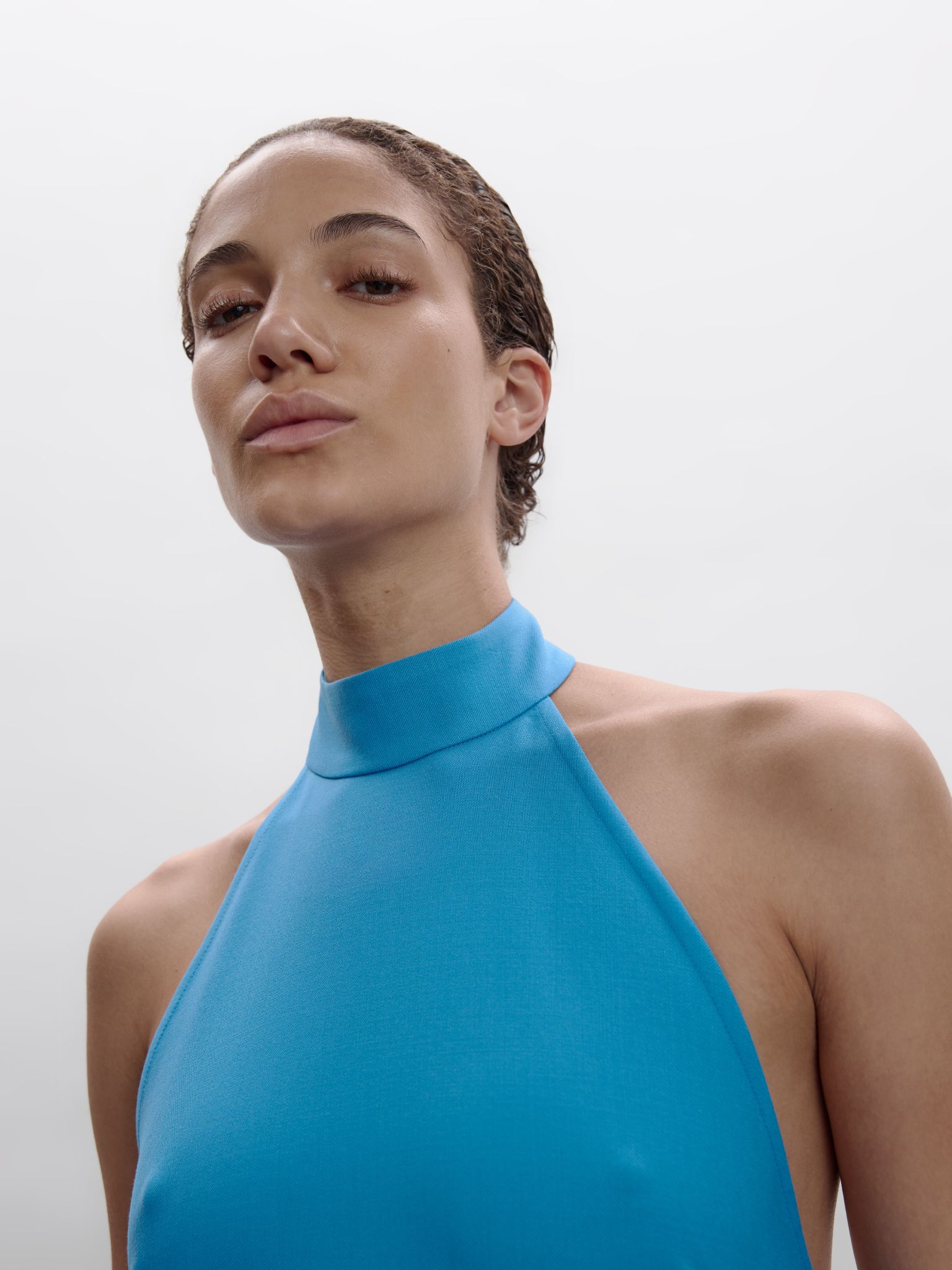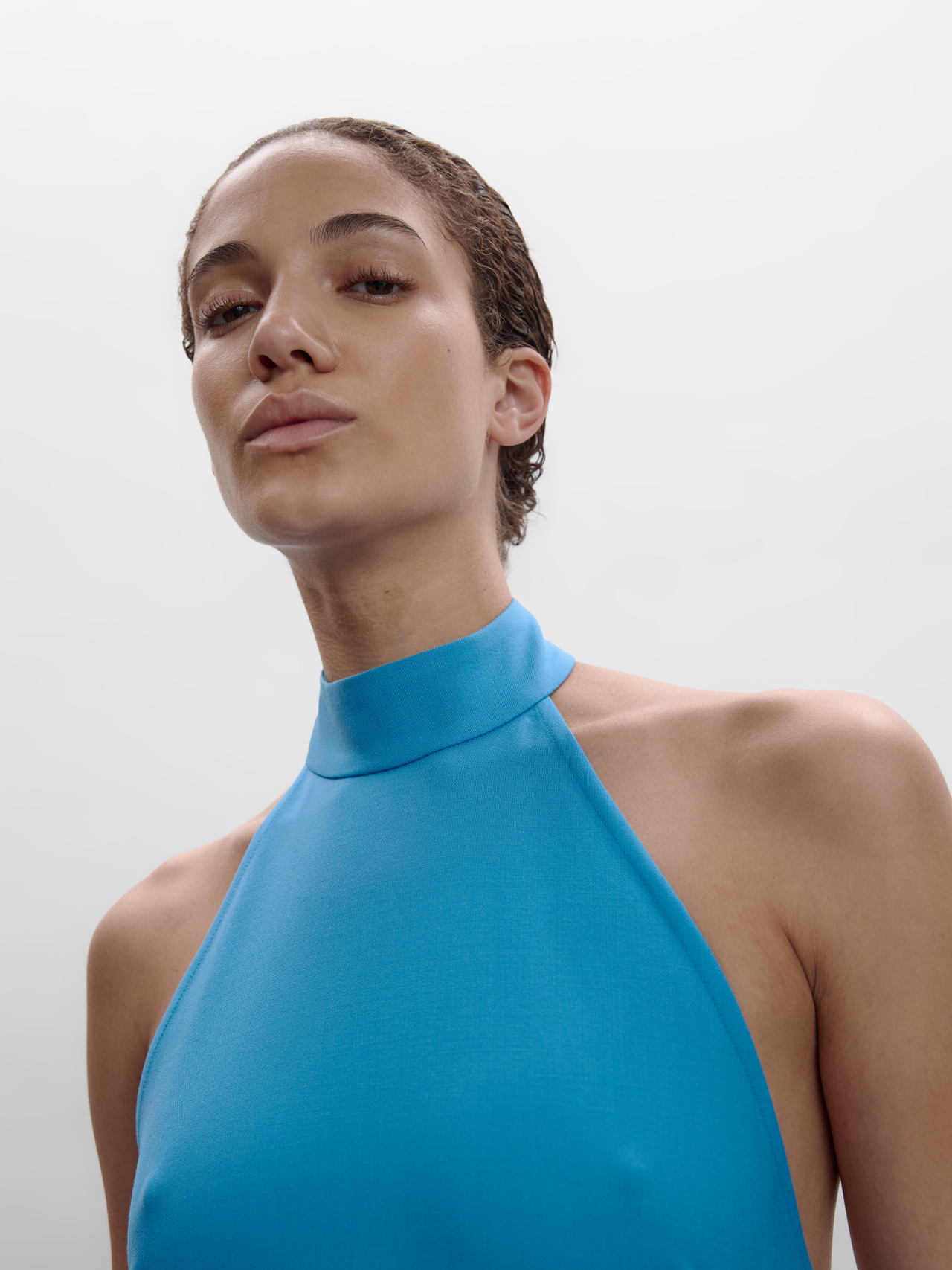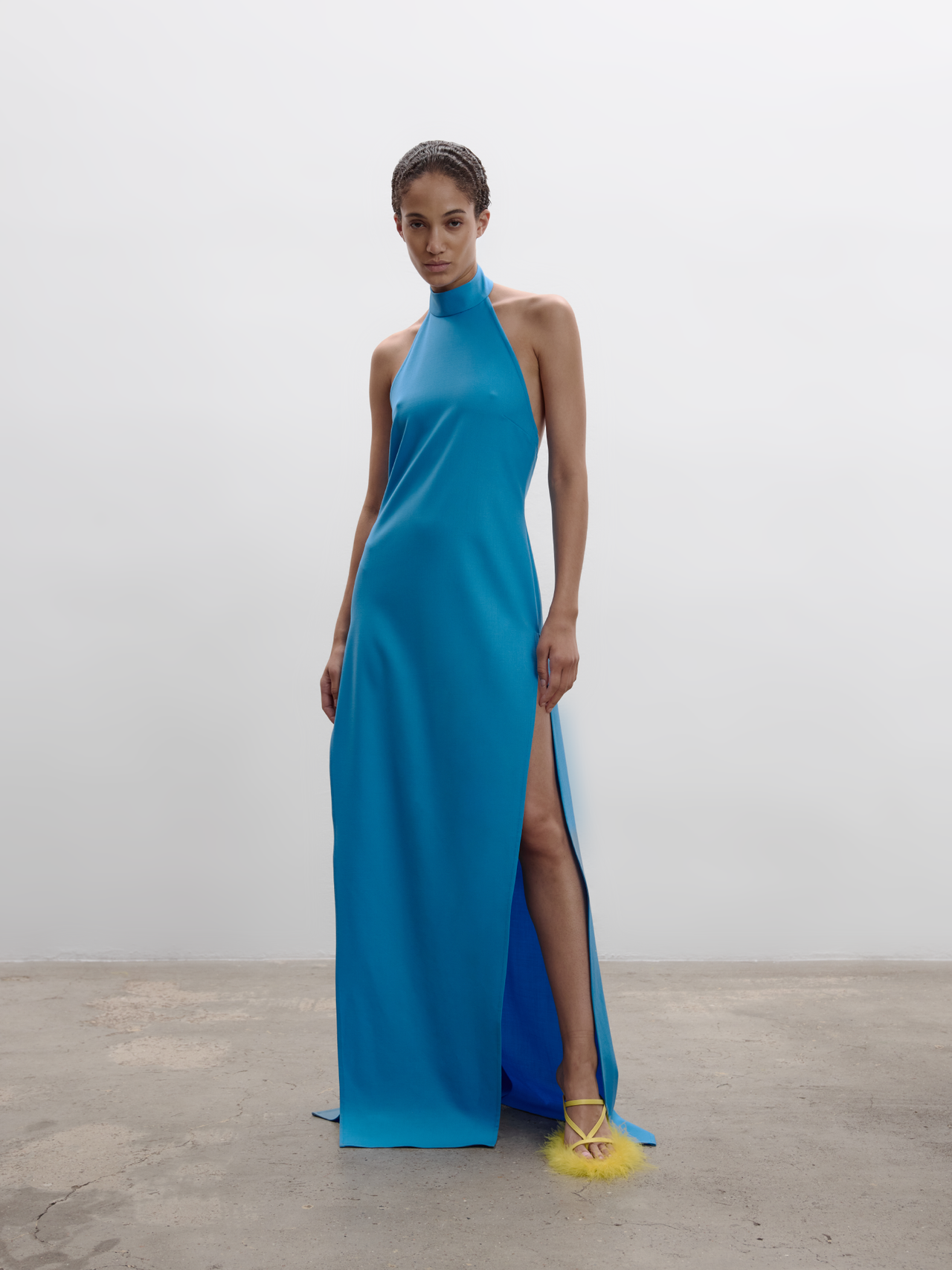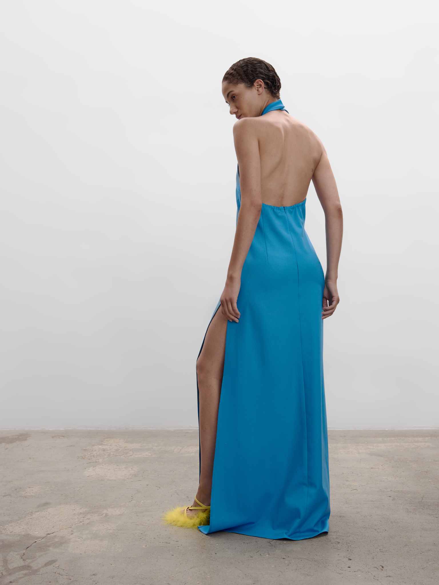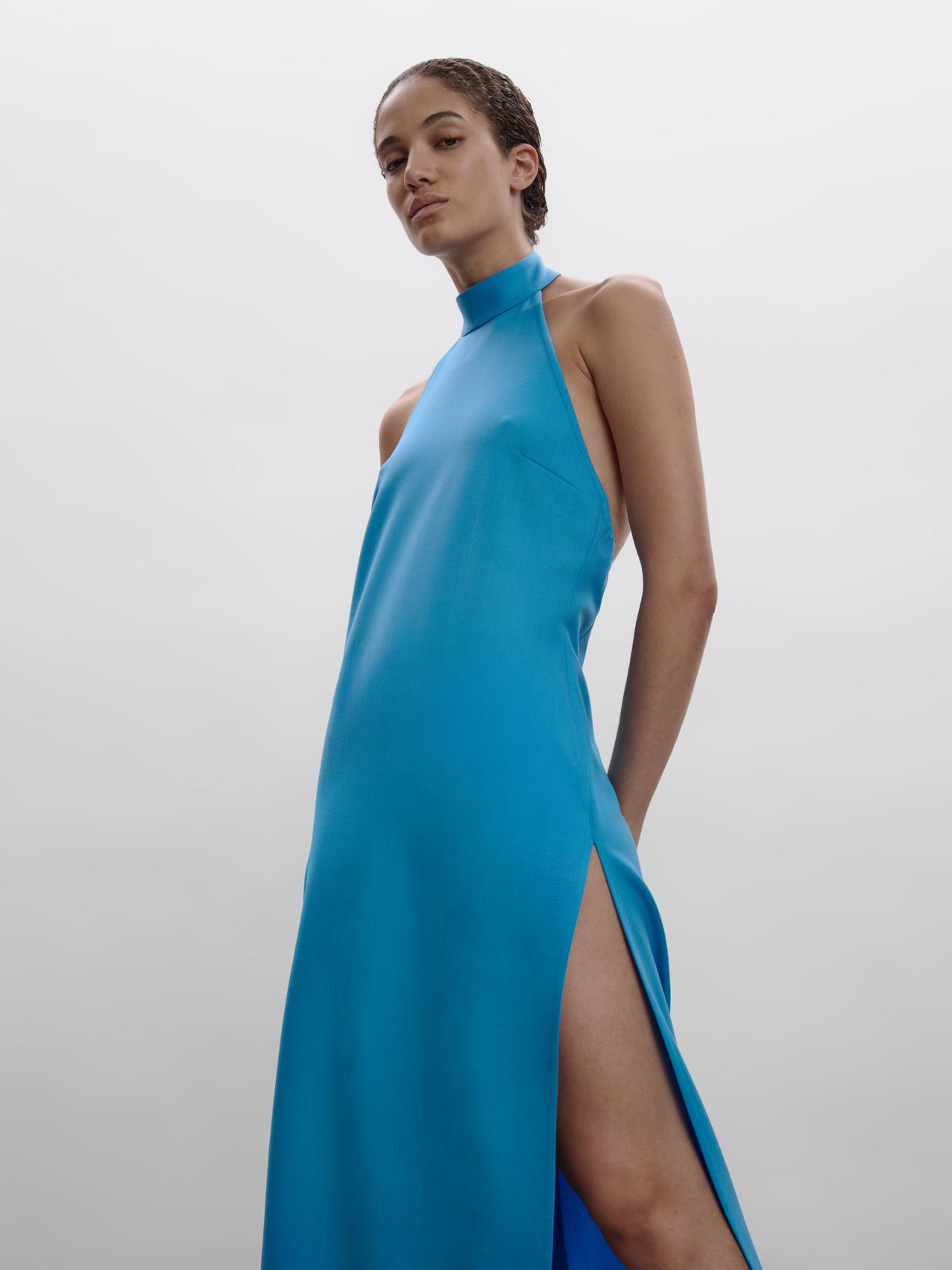 FULL-LENGTH HALTER DRESS WITH A NECK COLLAR AND AN OPEN BACK. CUT FROM A TAILORING-INSPIRED FABRIC THAT ADDS STRUCTURE WHILE TWO HIGH FRONT SLITS CREATE A MODERN, EFFORTLESS FLOW. A CLEAN, SLEEK SILHOUETTE WITH A CONTEMPORARY EDGE.